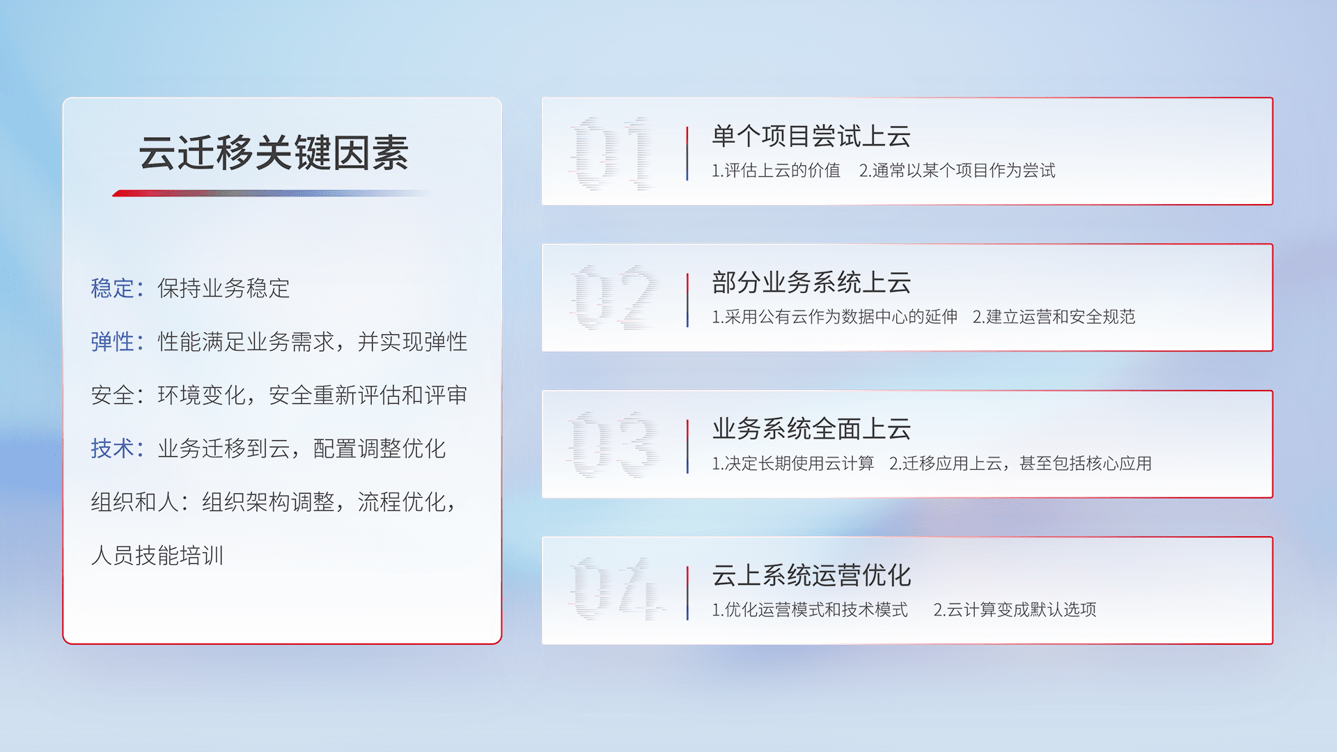 结合实际业务,,,,从规划设计、、、云平台选型、、云原生改造、、数据迁移、、集成交付,,,,迁移全过程为客户识别最佳上云路径,,,,做好风险识别管理,,,,设计网络架构、、身份权限、、安全审计合规、、、操作审计、、、日志审计、、、监控告警策略、、多站点容灾设计等,,,对云上基础设施进行整体规划,,,提升IT治理水平,,,以满足弹性、、、高可用、、、高性能的需求。。