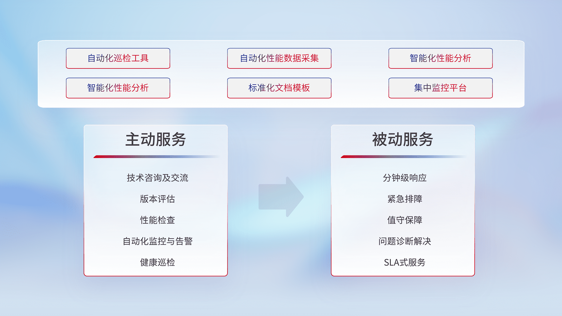 智能化工具和标准化文档,,,,保障服务质量,,提供主动服务(包含技术咨询、、、版本评估、、性能检查、、、、自动化监控与告警、、、健康巡检)和被动服务包含(分钟级响应、、、紧急排障、、、、值守保障、、、、问题诊断解决、、、SLA服务)。。。