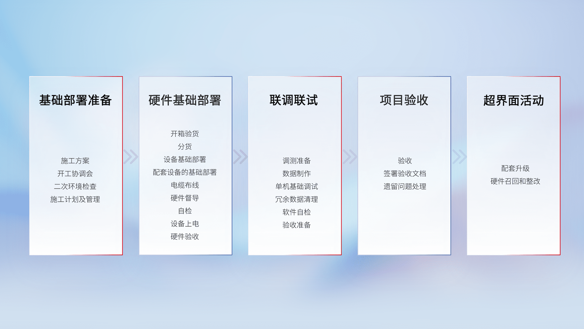从基础部署准备、、、、硬件基础部署、、联调联试、、、项目验收、、越界面活动的全过程可追溯,,,,保证施工质量和进度。。。